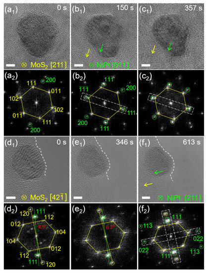 (a1–c1) Time series HRTEM images of a NiPt TONP on MoS2 at 0, 150, and 357 s; (a2–c2) FFT patterns corresponding to (a1–c1); (d1–f1) time series HRTEM images of another NiPt TONP on MoS2 at 0, 346, and 613 s; and (d2–f2) FFT patterns corresponding to (d1–f1). The scale bars are all 2 nm.
