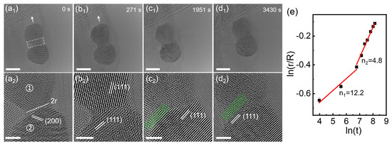 (a1–d1) Time series TEM images of the coalescence behavior of two adjacent NiPt TONPs on MoS2 at 0, 271, 1951, and 3430 s. The scale bars are 5 nm; (a2–d2) time series HRTEM images of the corresponding neck area in (a1–d1). The scale bars are 2 nm; (e) the relationship between the neck radius and the natural logarithm of time, which is fitted using a least-squares approximation. The error bars in the graph represent the standard deviation derived from five measurements of the neck radius taken at the corresponding moments.