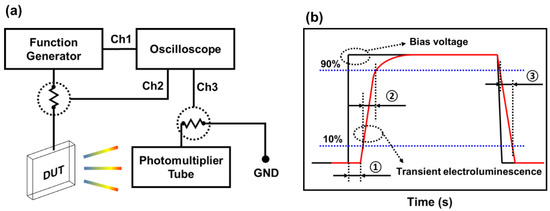 Diagram (a) illustrates the schematic of the transient electroluminescence measurement system, which includes a function generator, photomultiplier tube, and oscilloscope. The device under test (DUT) and ground (GND) are also indicated. Diagram (b) shows the definitions of delay time, rise time, and fall time, which are indicated by ①, ② and ③, respectively.
