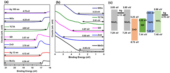 Each layer’s energy band in QLED was obtained by combining the data from UPS and Tauc plot [29]. The cutoff energy of the secondary electron obtained from the UPS data is shown in Figure 3a, and the highest occupied molecular orbital (HOMO) energy level is shown in Figure 3b. Films for UPS measurements were deposited on ITO-coated glass substrates. The ITO film was used to align the Fermi level in ZnO, QD, TCTA, MoOx, and WOx films, as well as to prevent charge accumulation. A He I line with an energy of 21.2 eV was employed as the UV light source for UPS measurements. The work function of each sample material was determined by subtracting the secondary electron cut-off energy (Figure 3a) from the 21.2 eV He I line energy. The calculated work function values are indicated on the spectra for each material in the figure. From the results shown in Figure 3b, the HOMO values of each material can be determined relative to the Fermi level. These values are also displayed on the spectra. By combining the results from Figure 3a,b with the bandgap energy obtained from the Tauc plot, an energy band diagram is obtained (Figure 3c). Figure 3c is a diagram of the energy band levels inside the QLED device, extracted from the obtained data. Compared to electron injection into QDs, it can be observed that the barrier for hole injection is high, which can result in electron excess and hole deficiency, and consequently affect the device characteristics.