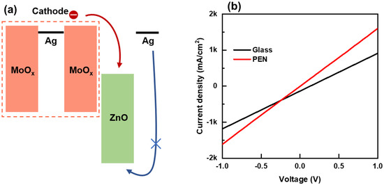 The differences observed in the current density-bias voltage and current efficiency-current density characteristics between QLED devices using PEN and glass substrates are presumed to be related to differences in their charge injection properties. To investigate this further, we fabricated electron-only devices (EODs) with the same stacking structure of OMO electrode/ZnO ETL/Ag electrode and analyzed their voltage-current characteristics. The energy-band diagram of the EOD is shown in Figure 5a. The bias voltage-current density curves of the EODs for both substrate types are presented in Figure 5b, clearly indicating that the electron injection into the EOD on the PEN substrate was higher compared to that on the glass substrate [6,29].