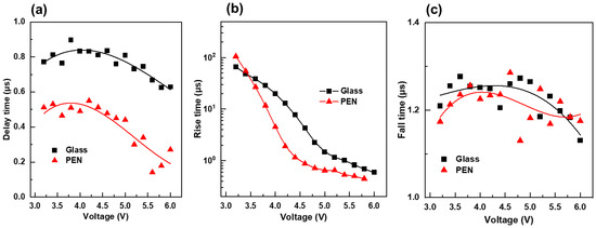 Transient electroluminescence results of PEN and glass QLEDs; (a) delay time, (b) rise time, and (c) fall time. Symbols represent the measured values from the transient electroluminescence curves. Solid lines in (a,c) indicate third order polynomial fit lines to the measured data.