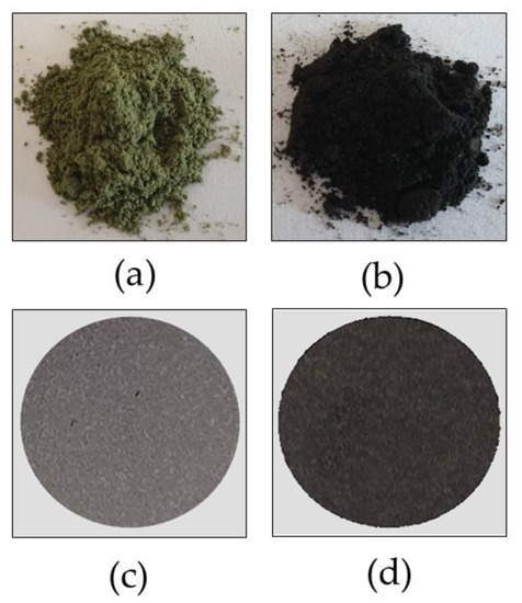 Photographs of anode catalysts: (a) Ni/BCY15-W-1100 and (b) Ni/BCY15-EG-1100, and anode pressed tablets: (c) Ni/BCY15-W-1100 and (d) Ni/BCY15-EG-1100.