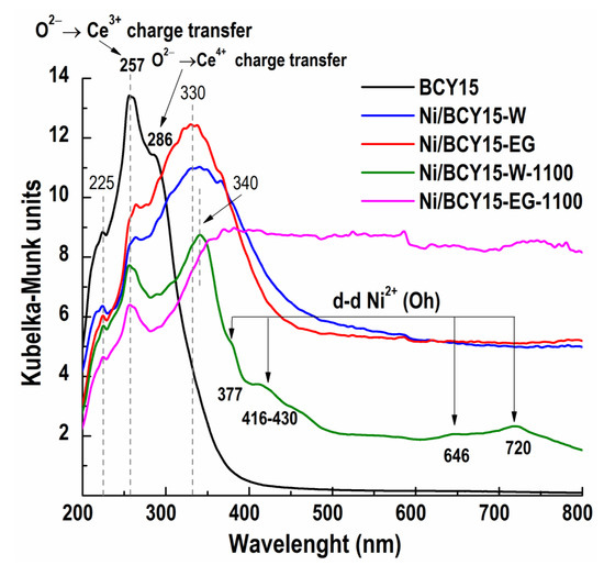 Concerning Ni/BCY-W-1100 surface electronic state of dark green colored sample after reoxidation of the metallic Ni (Figure 1a), the DR spectra contained absorption bands above 300 nm proving a Ni2+ coordination state: