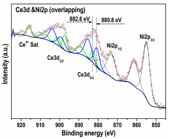 The energy ranges in Figure 5, marked with Ce3d5/2, Ce3d3/2, and Ce4+ Sat., represent the cerium line which is decomposed in two Ce3+ (blue line) with typical BE of about 880.8 eV and Ce4+ (green line) with BE of about 882.6 eV, respectively [47]. Ce3+ and Ce4+ ratio was estimated to be 1.5 in favor of Ce3+ ions (~60% of total cerium). Dashed line in the curve fitting procedure represents the Ni2p line, which is discussed above.