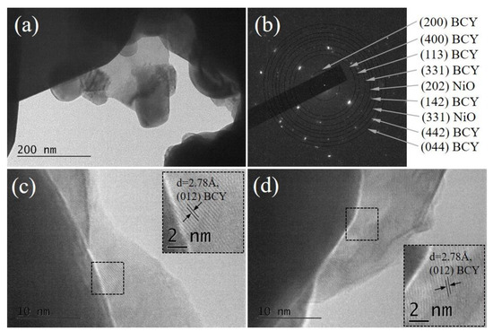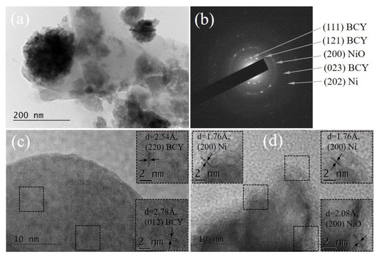 Microstructure of Ni/BCY-W-1100 sample: (a) TEM image at magnification 40,000×; (b) SAED pattern; (c,d) HRTEM images at magnification 600,000× with zoomed square areas as insets for better illustration of the lattice fringes.