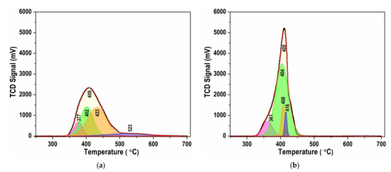 Comparison between the TPR profiles shows that both are asymmetric, but some other differences in the reduction temperature range, shapes, and hydrogen consumption values are observed (Figure 8a,b). Reduction of the Ni/BCY-W-1100 sample proceeds within a wide temperature range from 340 to 650 °C (Figure 8a), while the reduction of Ni/BCY-EG-1100 composite occurs in a relatively narrow temperature range of 320–460 °C (Figure 8b). In addition to the main temperature maximum at 409 °C, a shoulder at 450 °C and a broad reduction peak centered at 523 °C characterize the profile of Ni/BCY-W-1100 (Figure 8a).
