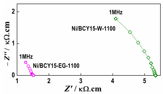 The specially designed impedance experiment in this study aimed to find also electrochemical evidence for the presence of small amounts of metallic Ni in the better performing Ni/BCY-EG-1100 and thus to confirm the results obtained by the characterization tools described in Section 3.1 and Section 3.4, Section 3.5, Section 3.6. Although in small quantities, the presence of pure Ni should decrease the resistance of the cermet. For this purpose, cold pressed samples of the Ni/BCY15-W and Ni/BCY15-EG materials were prepared and heated up to 1100 °C. For improving the contacts with the test rig Pt meshes, Ag current collectors were deposited following a standard procedure, which does not need additional heating. The results are shown in Figure 9. Although having high resistance at room temperature due to the isolating BCY matrix, the sample prepared in ethylene glycol medium has about four times lower resistance. The measurements of the capacitance confirmed similar tendency—lower capacity (20pF) for Ni/BCY15-EG-1100 with respect to Ni/BCY15-W-1100 (38pF) which is also an evidence for the increased conductivity due to the presence of pure Ni in the Ni/BCY15-EG-1100 sample.