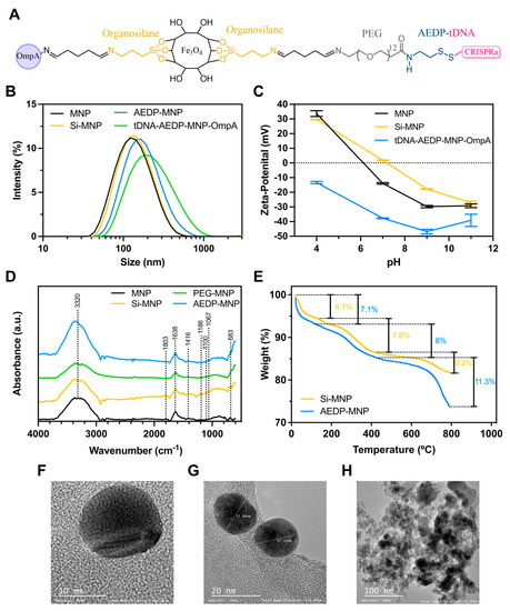 Physicochemical characterizations of magnetite, Si-MNP, and the final OmpA-AEDP-PEG-magnetite nanobioconjugates. (A) Chemical structure of the designed vehicle. (B) Hydrodynamic size distribution of MNPs, Si-MNP, AEDP-MNP nanoconjugate, and tDNA-AEDP-MNP-OmpA nanobioconjugate. (C) Zeta potential of the nanoconjugates. (D) FTIR spectra of MNP, Si-MNP, PEG-MNP, and AEDP-MNP nanobioconjugates. (E) TGA thermograms of the nanoconjugates and the corresponding weight loss percentages. (F,G) TEM images of individual magnetite nanoparticles. (H) TEM image of aggregates of the magnetite particles. Scale bars are 10 nm for figure (F), 20 nm for figure (G), and 100 nm for figure (H).