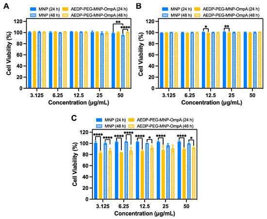 Cytocompatibility testing of the MNPs (black) and AEDP-MNP-OmpA (blue) nanoconjugates. Cell viability was evaluated at 24 (filled) and 48 h (pattern) in human astrocyte (NHA) (A), human dermal fibroblast (HDFa) (B), and rat primary mixed culture (CP3A4, containing astrocytes, microglia, and neurons) (C) cell cultures. DMEM was used as a negative control, and Triton X-100 (10% v/v) was used as a positive control. ANOVA and Tukey’s test were conducted for statistical analysis, using 5% as a significance level. * represents a significant difference with a p-value: 0.01 ≤ p-value ≤ 0.05; ** represents a significant difference with a p-value: 0.001 ≤ p-value < 0.01; **** represents a significant difference with a p-value < 0.0001.