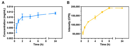 In vitro disulfide bond reduction was assessed through a TNBS assay and fluorescence measurements, revealing three distinct release rate regimes over the course of the experiment, each with decreasing delivery levels. The first regime occurred during the initial two hours, the second over the following four hours, and the third from that point onward until the experiment’s conclusion. The cumulative release amounted to approximately 86% of the initially loaded cysteine. Although both experiments exhibited similar trends, the minor differences may be due to the fluorescence measurements’ higher sensitivity compared to TNBS, which is more accurate for amino acid concentrations in the range of 20–200 µg/mL. For the intended application, delivery of the cargo within the first 8 h is likely sufficient to ensure an adequate circulation time and facilitate cell internalization [73].