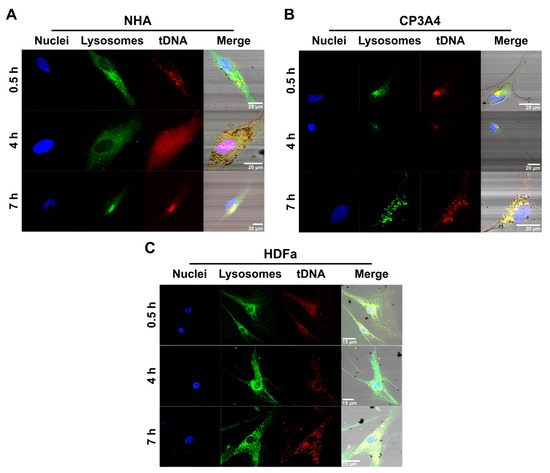 Confocal microscopy images of the internalization of the tDNA-AEDP-MNP-OmpA nanobioconjugates after 0.5, 4, and 7 h of incubation at 37 °C. Nuclei were labeled with DAPI dye, while endosome compartments were labeled with LysoTracker Green®. The experiment was performed in human astrocytes (NHA) (A), rat primary mixed culture cells (CP3A4, containing astrocytes, microglia, and neurons) (B), and human dermal fibroblasts (HDFa) (C). Scale bars are 10 µm for figures (A,B), and 15 µm for figure (C).