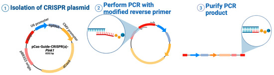 CRISPick® software was employed to design sgRNAs targeting the pink1 gene, with the lowest bioinformatic predictions for off-target activity being selected. An 8.2 kb origin plasmid, “CRISPRa—CRISPR/Cas9 SAM Synergistic Activation Mediator,” served as the base vector to engineer the final construct. Vector digestion was performed using the BamHI and BsmBI enzymes in a single reaction for 4 h at 37 °C, followed by a 16 h incubation in Cutsmart buffer at 55 °C. The vector was subsequently purified using the Monarch PCR & DNA Cleanup Kit. Ligation was carried out using the T4 ligase enzyme with a 16 h incubation at 16 °C. The final construct was transformed into E. coli DH5α, and the presence of sgRNA was validated via PCR. Finally, the sgRNA insert sequence was verified through Sanger sequencing.