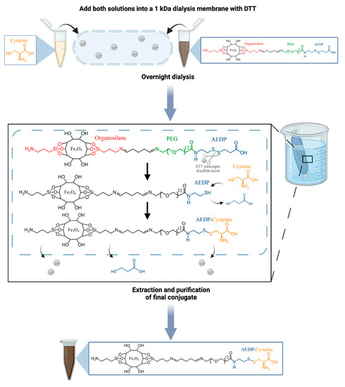 For the proof-of-concept cysteine conjugation, 250 µg of the AEDP-MNP nanobioconjugates was dissolved in 40 mM DTT solution, while a cysteine solution with a molar ratio of 7:1 (cysteine:AEDP-MNP) was prepared in 40 mM DTT. Then, 2.5 mL of each solution was added to a dialysis cassette equipped with a 1 kDa MWCO membrane for the thiol-coupling reaction. The dialysis was performed overnight against 100 mL of type I water, which was replaced every 2 h. As the process continued, the initial reducing conditions generated by DTT were gradually replaced by oxidizing conditions, resulting in the formation of Cys-AEDP-MNP nanoconjugates [36].