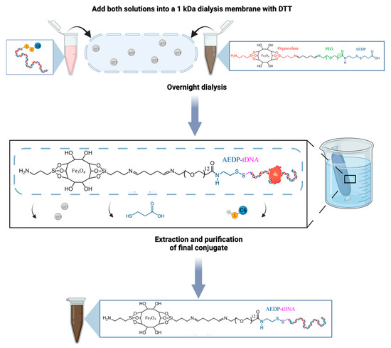 For the tDNA conjugation, 10 mg of the AEDP-MNP conjugates was dissolved in 5 mL of type I water, and 25 µg of tDNA was added to a separate 5 mL solution of 10 mM DTT. The same dialysis procedure as previously described was conducted, but with a 2 kDa MWCO dialysis membrane instead. After dialysis, the tDNA-AEDP-PEG-MNP nanoconjugates formed were transferred to a centrifuge tube and washed with NaCl solution, as described previously (Scheme 3). To prevent potential DNA degradation, the nanoconjugates were resuspended using brief sonication periods of 10 s at 37 kHz and 80 W in an ultrasonic bath (Elmasonic Easy 30 H, Elma Schmidbauer GmbH, Singen, Germany).