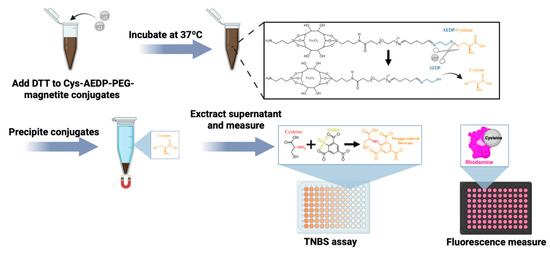 To assess the disulfide bond cleavage under reducing conditions, in vitro delivery of the Cys-AEDP-MNP nanoconjugates was conducted (Scheme 4). A mixture of 500 µL of the Cys-AEDP-MNP nanoconjugates (500 µg/mL) and 500 µL of DTT (20 mM) was incubated at 37.5 °C in an Eppendorf tube. The samples were collected at 0.5, 1, 2, 4, 6, 8, and 24 h of incubation to monitor the reaction kinetics. The Cys-AEDP-MNP nanoconjugates in the collected samples were magnetically precipitated, and 100 µL of the resulting supernatant was transferred to a 96-well microplate.