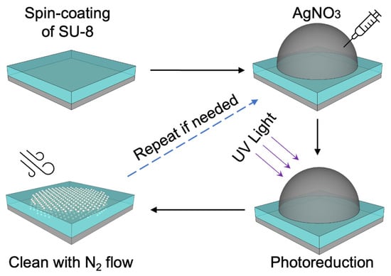 SU-8 photoresist is a widely used negative-tone chemically amplified photoresist due to its heat and acid/base resistance [20], as well as its excellent mechanical properties. It finds extensive applications in the fields of microelectromechanical systems (MEMS) and microfluidics [21]. Its high compatibility with biological systems [22] also makes it suitable for use in biosensors. Additionally, its high transparency in the visible light range renders it applicable in optics [23]. SU-8 is typically spin-coated on wafers using standard processes and then undergoes patterning. Its characteristic of generating a large number of free radicals under UV exposure and elevated temperature also makes it an ideal material for reducing metal precursors within its structure via optical lithography [24,25,26]. For instance, Tan et al. made Au/SU-8 nanocomposites through the photoreduction of a gold precursor and SU-8 mixture for electrodes and grating applications [24]. Fischer et al. fabricated Ag/SU-8 nanocomposites through the photoreduction of a silver precursor and SU-8 mixture and explored their localized surface plasmon resonance (LSPR) response [25]. However, when mixing with the nanoparticles in solution form, the loading effect in the solution influences the spin-coating quality of the film and nanoparticle distribution inside the film.