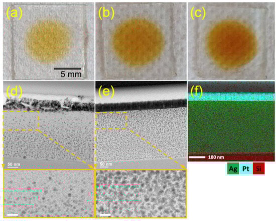 (a–c) Optical images of the Ag/SU-8 nanocomposites after one, two, and three photoreductions. The concentration of AgNO3 was 0.5 mM. (d,e) Cross-sectional TEM images of the Ag/SU-8 nanocomposites photoreduced from 0.5 and 50 mM AgNO3, respectively. (f) EDS elemental analysis of Ag/SU-8 nanocomposites photoreduced from 50 mM AgNO3. The scale bars in the insets at the bottom of (d,e) measure 20 nm.