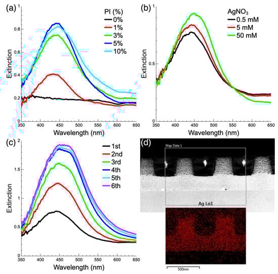 The extinction spectra of Ag/SU-8 nanocomposites are displayed in Figure 3. A prominent absorption peak is observed at a wavelength of 440 nm, corresponding to the LSPR peak of reduced AgNPs. The effect of photoreduction parameters on AgNPs is evident from the extinction spectra. Figure 3a illustrates the impact of varying additional PI concentrations on photoreduction. The PI used for SU-8 polymerization is triarylsulfonium hexafluoroantimonate salt, a photoacid generator. Diluted SU-8 (SU-8 3025/cyclopentanone at a weight ratio of 1:8) was mixed with varying additional PI concentrations ranging from 0 to 10 wt%. The SU-8 without added PI (0 wt%) is the diluted commercial SU-8 that already contains a certain amount of PI. As the amount of added PI increases, the photoacid generation rate during UV exposure also increases, leading to the production of more free radicals required for reduction [26]. The most notable difference is observed between SU-8 without added PI and SU-8 with 1 wt% added PI. All samples with added PI exhibit a 440 nm absorption peak corresponding to AgNP LSPR after the first reduction, while the original SU-8 sample shows no significant absorption peak. The original SU-8 requires multiple reductions before its reduction effect approaches that of the PI-added sample (see Figure S1), indicating that adding PI improves reduction efficiency. As the amount of PI increases, the intensity of the absorption peak also increases, reaching its maximum at 5 wt% PI. To maintain consistency in subsequent experiments and facilitate observation of differences in other parameter effects, all subsequent experiments used SU-8 with 5 wt% added PI. Figure 3b shows reduction results at various AgNO3 concentrations. As PI concentration increases, the LSPR absorption also increases, consistent with the increase in AgNP density shown in the TEM images of Figure 2a,b. Figure 3c displays the spectra of samples subjected to multiple photoreduction cycles. As the number of photoreduction cycles increases, the corresponding absorption peak intensity strengthens and the bandwidth widens. After the fourth reduction, however, the extinction peak does not exhibit a significant increase. The photoreduction process can also be performed directly on SU-8 nanostructures, resulting in the formation of Ag/SU-8 nanocomposites with a nanostructured shape. First, a nanopillar array with a diameter of 300 nm, a period of 600 nm, and a height of 300 nm was patterned through nanoimprint lithography [26]. Then, a drop of AgNO3 solution was applied to the surface of the SU-8 nanopillar array and exposed to UV light. Figure 3d shows a cross-sectional TEM image of 50 mM AgNO3 photoreduced in a SU-8 nanopillar array with 2 reduction cycles. The AgNPs within the SU-8 nanopillars were identified through EDS elemental analysis, as shown in the bottom inset of Figure 3d. The AgNPs were uniformly distributed within the SU-8 nanopillars.