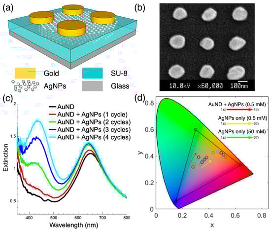 (a) The schematic of the composite surface made up of gold nanodisks and Ag/SU-8 nanocomposites. (b) The top-view SEM image of the composite surface. (c) The measured extinction spectra of the composite surface with the reduction in AgNPs from 0 to 4 cycles. (d) The CIE 1931 color space calculated from the measured spectra of the various Ag/SU-8 nanocomposites and composite surfaces.
