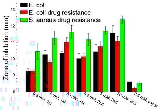 Antibacterial inhibition zones of various Ag/SU-8 nanocomposites against antibiotic-sensitive Escherichia coli, antibiotic-resistant Escherichia coli, and antibiotic-sensitive Staphylococcus aureus.