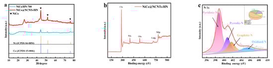 In Figure 1a, the crystalline structures and phases of the samples are verified using the typical powder X-ray diffraction (XRD) pattern. The peaks located at around 44.2°, 51.6°, and 75.9° were ascribed to the (1 1 1), (2 0 0), and (2 2 0) crystal planes of the NiCo alloy (JCPDS, No. 15-0806) (JCPDS, No. 04-0850), respectively [20,29]. Furthermore, compared with pure NiCo/HN-700, the relatively broad peak at around 26.7° of NiCo@NCNTs/HN was attributed to the (002) crystal plane of graphite carbon. Thus, it clearly demonstrated that with DCDA, the high graphitization degree of carbon skeletons can be obtained due to the formation of N-doped CNTs. Generally, a high degree of graphitization can improve the conductivity of the catalyst, which is beneficial to the charge transfer during the electrolysis process [30]. The XRD patterns of Ni@NCNTs/HN and Co@NCNTs/HN are shown in Figure S1. The diffraction peaks correspond to pure metallic Co0 (JCPDS, No. 15-0806) or Ni0 (JCPDS, No. 04-0850), which further shows that Co0 or Ni0 is successfully formed in the structure of NCNTs/HN. The (002) crystal plane of graphite carbon was also observed for Ni@NCNTs/HN or Co@NCNTs/HN.