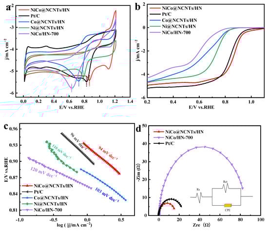 To initially evaluate the ORR activities of Pt/C, Ni@NCNTs/HN, Co@NCNTs/HN, NiCo/HN-700, and NiCo@NCNTs/HN catalysts, cyclic voltammetry (CV) tests were performed in a 0.1 M O2-saturated KOH solution [50]. In Figure 4a, the reduction peak of the NiCo@NCNTs/HN was located at around 0.87 V, which was superior to those of Pt/C (0.83 V), Ni@NCNTs/HN (0.78 V), Co@NCNTs/HN (0.72 V), and NiCo/HN-700 (0.63 V). As reported previously, the inevitable oxidation of CoNi alloys in the hybrids can form the active Co(II) species, which is directly responsible for the high ORR activity [51,52,53,54,55]. Co(II) can change the chemisorption mode of oxo intermediates due to the strong interaction between the orbital of the oxygen molecule and the d orbital of central atomic vacancy, thus effectively weakening the O-O bond to facilitate the dissociation of oxygen molecules to produce H2O [51,52]. It is noteworthy that, compared to NiCo/HN-700, the excellent ORR activity of the NiCo@NCNTs/HN catalyst was chiefly attributed to the introduction of N-doped CNTs, with high electrical conductivity, and the N-species served as highly active sites for ORR [20,56]. Moreover, the self-grown NCNTs on the surface of the hollow spherical structure can promote the charge transfer between CoNi alloys and NCNTs to gain the excellent ORR activity.