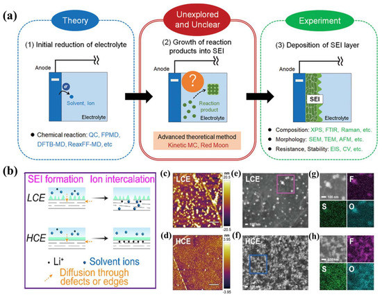 (a) Overview of experimental and theoretical analyses of the SEI formation process, consisting of three major steps [102]. Reproduced from Ref. [102] with permission from Wiley; (b) scheme of SEI formation and lithium ion intercalation in HCE and LCE; quasi in situ AFM of the SEI formed on HOPG electrodes under (c) LCE and (d) HCE conditions; SEM images and corresponding EDS spectra are shown in (e,f) for LCE conditions and (g,h) for HCE conditions [9]. Reproduced from Ref. [9] with permission from Elsevier.