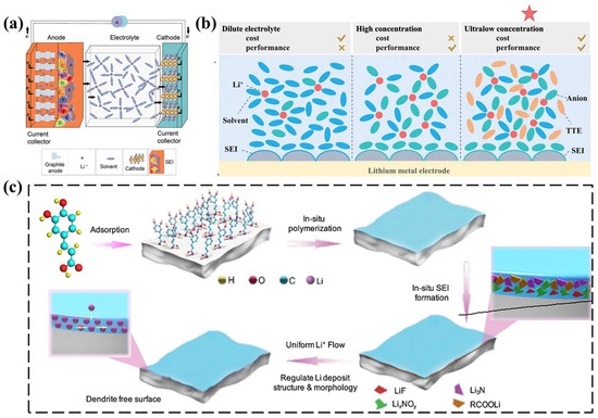 SEIs include organic regions next to the electrolyte (oligomers and lithium carbonate salts) and inorganic regions near the anode (Li2O, LiF, etc.) (Figure 9a) [110]. The outer organic region is a porous heterogeneous structure, where both lithium ions and solvent molecules can reach the interface. The inner inorganic region can transfer lithium ions [93,111]. However, if the SEI produced by electrolytes with the same properties has a similar composition, its structure is highly variable. Researchers found that even in two similarly composed LEs, LE-1(0.6M LiBF4 and 0.6M LiBOB, EC:EMC = 3:7, v/v) and LE-2 (1.2M LiDFOB, EC:EMC = 3:7, v/v), the cycle stability of electrolyte-2 is obviously better than that of electrolyte-1 [112]. This is mainly due to the formation of nanostructured LiF in the SEI of electrolyte-2. The capping ability of oxalic acid in LiDFOB can induce the uniform growth of nanostructured LiF. Nanostructured LiF in SEIs forms a diffusion field gradient on the surface of the LMA, which is beneficial to the cycle performance of the battery. In addition, the SEI formation rate is the key to achieving high Coulombic efficiency. HCE can induce dense lithium deposition. However, HCE is expensive and suffers from poor wettability. Chen et al. [113] used 1,1,2,2-tetrafluoroethyl-2,2,3,3-tetrafluoropropyl ether (TTE) to dilute electrolyte D5 (nTHF:nLiFSI:nTTE = 14:5:0, molar ratio) and prepared local high concentration electrolyte H1 (nTHF:nLiFSI:nTTE = 14:5:14, molar ratio). The solvation structure of lithium ions in H1 is consistent with that in D5, which maintains the high concentration effect of electrolyte (Figure 9b). Notably, the essence of an SEI is to reduce the thermodynamic properties of electrolytes and the kinetic properties of the LMA to reduce electrolyte consumption. Therefore, it is worth considering introducing additives that inhibit electrolyte decomposition to establish robust SEIs. Luo et al. [114] prepared a multifunctional SEI for dendritic anodes using catechol and acrylic groups as electrolyte additives (Figure 9c). Catechol reduces electrolyte consumption. The acrylic anion forms a uniform polymerization layer on the anode surface, which is beneficial to long-term cyclic stability.