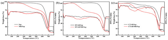TGA and DTG curves of (a) Sep and MR/Sep, (b) DTAB/Sep and DTAB/MR/Sep, (c) CTAB/Sep and CTAB/MR/Sep.