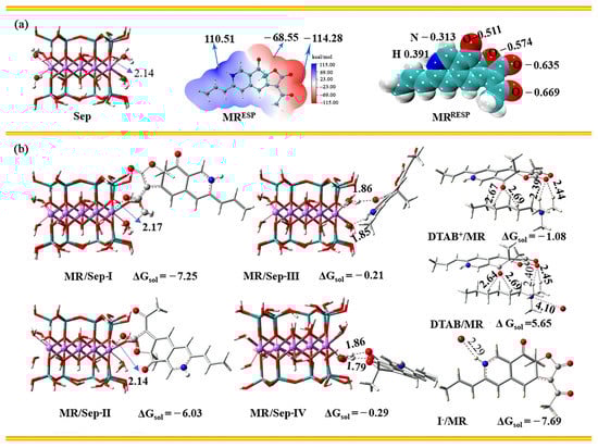 (a) The optimized model of Sep, the molecular surface electrostatic potential (ESP) and restrained electrostatic potential (RESP) atom charge of MR, and (b) The optimized adsorption structure between Sep and MR or DTAB and MR (the charge of Gibbs free energy is kcal/mol and the distances are in Å).