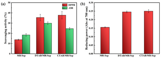 (a) Scavenging effects of MR/Sep, DTAB/MR/Sep, and CTAB/MR/Sep on DPPH radical and hydroxyl radical, and (b) reducing power (Abs at 700 nm).