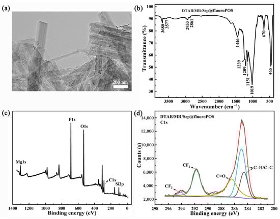 (a) TEM images, (b) FTIR spectra, (c) XPS survey spectra, and (d) high-resolution C1s spectra of DTAB/MR/Sep@fluoro POS coatings.