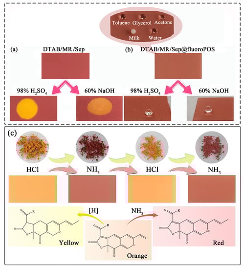To investigate the color response of hybrid nanopigments and corresponding coatings under different atmospheres, the DTAB/MR/Sep powder and DTAB/MR/Sep@fluoro POS coating were put in an HCl or NH3 gas-filled desiccator, respectively. The samples with a red color were yellow in the acidic gas (Figure 9c). It was interesting to see that the color turned red again after the yellow samples were exposed to an alkaline gas. Furthermore, the reversible allochroic behavior between yellow and red could still be achieved after two acid/base cycles. The color changes of the DTAB/MR/Sep@fluoro POS coating were similar to those of hybrid nanopigments in different atmospheres. No influence on the CAs was observed after two acid/base cycles (Table S6). The reversible acid/base allochroic phenomenon of the as-prepared samples was mainly dependent on the reduction and amination of the orange pigments with HCl and NH3 to obtain yellow pigments and red pigments, respectively [3,4,43]. Based on the rapid and highly reversible color switching of DTAB/MR/Sep hybrid nanopigments and the corresponding superamphiphobicity coating between different atmospheres, it is possible to prepare an intelligent coating with excellent stability for environmental monitoring.