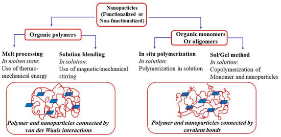 Due to the nanoscale impacts and profoundly actuated debris of the PNCs, a massive part of the coatings of nanofillers have high morphological properties with electro-chemical, active coupling, functional CNT-influenced polymers, and so on [86,87,88,89,90]. These PNCs can be utilized for material reinforcement, as electrolytes, drugs, biomedical materials, thin films, etc. [89]. The major processing methods for PNCs are sol–gel amalgamation, oxidative polymerization, thermally atomized methods, microwave-assisted processes, composite blending, electrochemical deposition, reactant chain polymerization, etc. [91,92,93].
