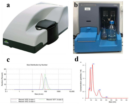 (a) Particle size analyzer of Zetasizer (ZS90). (b) Nanoparticle tracking analyzer (NTA). Characterization of the nanobubbles by using Zetasizer (c) and NTA (d).