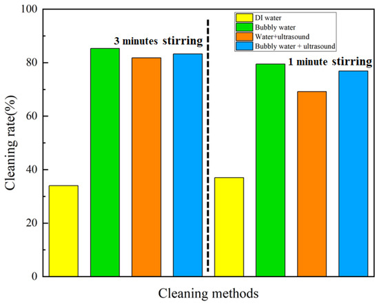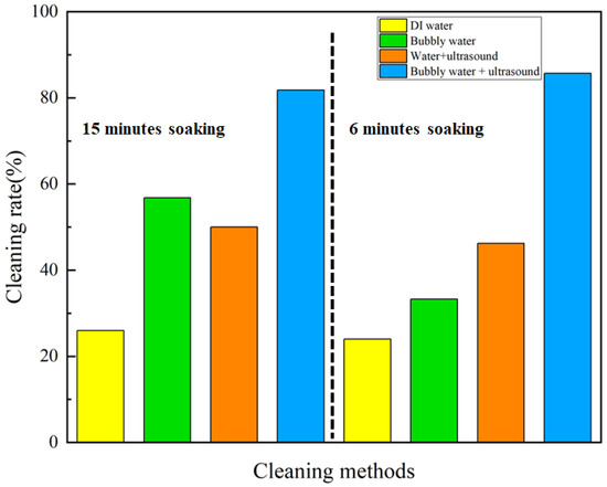 As illustrated in Figure 7, in the case of cleaning via soaking for 15 min, the addition of micro-/nano-bubbles or ultrasound, and the coupled micro-/nano-bubbles and ultrasound, improved the cleaning rate by 130.5%, 13.8%, and 89.2%, respectively, relative to DI water. In the case of cleaning via soaking for 6 min, the addition of micro-/nano-bubbles or ultrasound, and the coupled micro-/nano-bubbles and ultrasound, improved the cleaning rate by 81.0%, 40.5%, and 130.4%, respectively.