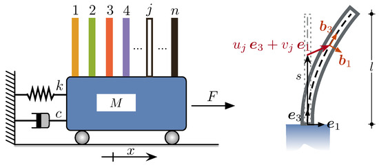 We rescale the absolute displacements of the jth beam and the shuttle mass displacement x by the length of the beams l, time by with , where is the mass per unit length of the reference beam whose bending stiffness is denoted by . By retaining the symbols s and t as the beam nondimensional arclength and time, respectively, and using the prime for space derivatives and the over dot for time derivatives, the ensuing nondimensional Equation (8) become: