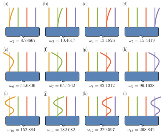 This allows to compute the coefficients of the eigenvectors. In particular, the coefficients are first obtained as function of through the system (for ), and finally is computed by imposing the previous normalization condition. According to this mass normalization, the frequencies are obtained as