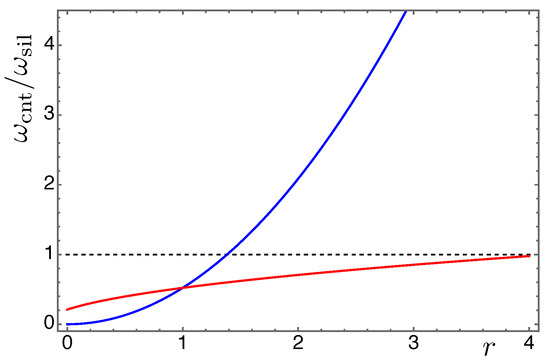 Natural frequencies ratio of a beam made by a nanocomposite () with respect to a beam made of silicon (). Ratio varying for increasing beam length as of the silicon beam (blue curve), and ratio varying for increasing volume fraction as of the CNT beam (red curve).
