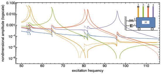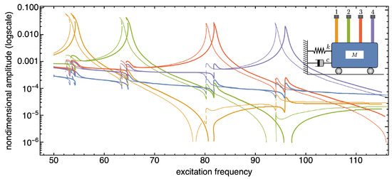 By taking one trial function for each cantilever, a 5-dof overall ROM is obtained (i.e., 1 dof for the shuttle mass and 1 dof for each of the four microcantilevers). This approach was shown to be acceptable in [53,54] where a convergence analysis was carried out. We will also consider the parameters and for the shuttle mass damping ratio and the microcantilevers damping ratio, respectively; all the other mechanical parameters are those reported in the previous section.