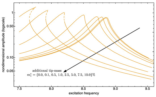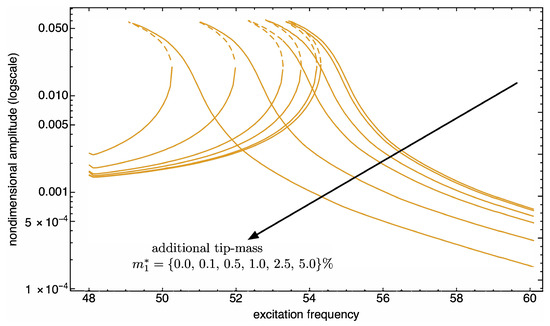 Such figures not only reveal the expected trend of the resonance peak shift upon increasing the tip mass, but they also highlight a change in the length of the unstable branch of the response curve. In fact, around the first bending mode frequency, the shift in frequency occurs with a hardening nonlinear response which becomes more and more evident (see Figure 12); on the other hand, around the second bending mode frequency, the softening nonlinear response does not change much qualitatively (see Figure 13).