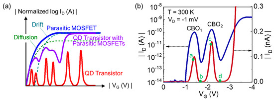 Despite such a parasitic MOSFET effect, the fabricated Si multi-QD transistor clearly exhibits two large CBO peaks at 300 K in its ID–VG characteristic curves (Figure 2b). The magnitudes of the peak-to-valley current ratio (PVCR) are 261 and 288 for the first CBO1 and the second CBO2, respectively. In addition, the values of the full width at half-maximum (FWHM) are approximately 192 and 188 mV for CBO1 and CBO2, respectively. In principle, for the room-temperature observation of such clear CBO characteristics, the one-electron (or hole)-addition energy (Ea) should be sufficiently larger than the thermal energy at room temperature (i.e., Eth ≈ 26 meV at 300 K) [20,50]. Ea is given by