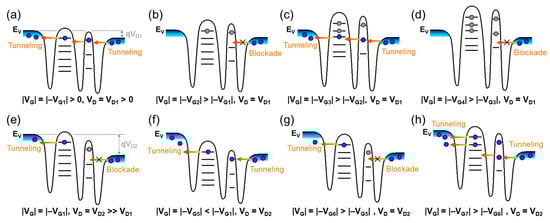 Next, we explain the VD-dependent CBO evolution, which can be observed in Figure 3a,b. For this, firstly, we assume that the device was set on the initial single-hole-tunneling stage at |−VG1| and VD1 (i.e., Figure 5a). If one increases VD from VD1 to VD2, the dot potential also increases (Figure 5e) because the capacitive coupling between QD and D would be no longer negligible at a high VD [17]. At this stage, the single-hole-tunneling event would suddenly stop because the imbalanced capacitive-coupling strengths between G-QD and QD-D would break the tunneling condition (i.e., blockade state). To perform the single-hole-tunneling transport under the same VD2 condition, the dot potential should be increased until the D-side Fermi level can meet the first excited quantum state of QD2. Therefore, one needs to decrease the magnitude of −VG from |−VG1| to |−VG5| (where 0 < |−VG5| < |−VG1|) when VD is increased from VD1 to VD2 (Figure 5f). Namely, when VD is positively increased, the VG bias point should also be positively shifted to satisfy the tunneling-on condition via the first excited state. This eventually leads to the CBO shift toward the A and A’ directions, as already observed in Figure 3a,b. From this bias point (i.e., |−VG5| and VD2), one can demonstrate the multiple CBO peaks by increasing the magnitude of |−VG| over |−VG5|. For example, at the same VD2, the second and/or the third CBO peaks can be demonstrated by repeating the tunneling-off (i.e., |−VG6| > |−VG5|, Figure 5g) and tunneling-on (i.e., |−VG6| > |−VG5|, Figure 5h) conditions. Here, it should be also noted that the overall quantum energy states are energetically split between QD1 and QD2 because of the high VD2. Namely, the overall dot potential of QD1 is lower than that of QD2 due to the high VD. This eventually gives rise to the increase in co-tunneling events because of the energetic imbalance between QD1 and QD2. As a result, the device exhibits the extra CBO peak through the renormalization of stochastic tunneling conditions at a higher VD (e.g., CB3 in Figure 3a,b).