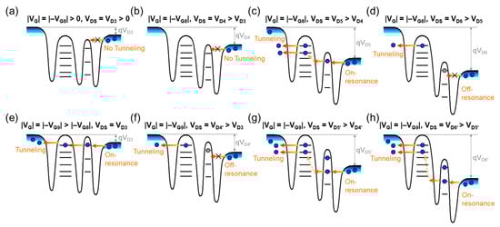 The NDC evolution can also be explained by using the aforementioned analytical energy-band diagram. Firstly, we interpret the NDC mechanism of the present device at a low VG (e.g., VG = |−VG8| > 0). At this VG bias condition, no hole carriers could transfer from D into QD2 because the Fermi level of D is far from the first excited state of QD2 (Figure 7a). In other words, due to the large Δε of QD2, it is hard to perform the resonance state when both VD and VG are low. The similar situation is maintained unless the magnitude of VD is increased to match the on-resonance condition (Figure 7b,c). When increasing VD after the on-resonance at the first excited state, the tunneling event is prohibited again because of the large Δε between the first and the second excited quantum states (Figure 7d). Thus, one can surmise that the NDC could occur at the relatively high VD region when VG is low. Next, we explain the NDC evolution toward the lower VD region, which was observed when the higher VG was applied (Figure 6b). Here, let us assume that the device was set at the on-resonance state at an increased VG (i.e., |−VG9| > |−VG8|), even if the magnitude of VD is the same as the initial VD3 above (Figure 7e). From this bias point, if one increases the magnitude of VD (i.e., VD = VD4′ > VD3), the resonance state is immediately changed from ‘on’ to ‘off’ (Figure 7f). When increasing VD more from VD4′ to VD5′, the second on-resonance state occurs at the second excited state (Figure 7g). At a high VD (e.g., VD6′ > VD5′), the on-resonance state would be retained because, at the high VD, the dot potential would also be capacitively coupled to the drain potential (Figure 7g). As a result, the NDC can occur at the relatively lower VD region when a higher VG is applied to the device. To briefly summarize, the NDC evolution would take place toward the low VD region as VG increases.