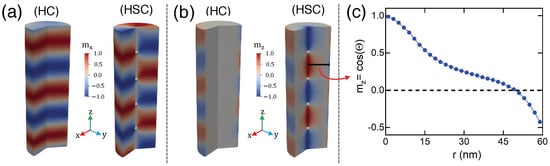 The described model allows us to obtain the magnetization relaxed states as a function of L using two initial configurations: a ferromagnetic state and multiple domains with opposite directions. We start by obtaining the relaxed configurations starting from an initial state given by m x = 1 and with a vanishing magnetic field. Our results reveal that the final magnetic pattern consists of an in-plane helicoidal configuration (HC), with period P, as depicted in Figure 1a ( m x -component) and Figure 1b ( m z -component). To characterize the HC magnetization field, we parameterize it in a Cartesian basis as m HC = cos Θ HC z ^ + sin Θ HC υ ^ ; υ ^ = cos Φ HC x ^ + sin Φ HC y ^ , where Θ HC = Θ HC ( z ,   r ) describes the cross-section magnetization profile and Φ HC ( z ,   r ) defines the magnetization helicity. Therefore, the HC can be described by
