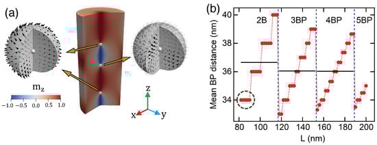 The next step of our work is to analyze the nucleation of multiple BPs in the nanowires. It has been previously shown that an initial state composed of monodomains with magnetization pointing along opposite directions in successive regions present BPs as relaxed states [39]. We follow this idea and divide the magnetic nanowires into n sections along the z-axis, with n ranging from 1 to 6, each one with a magnetization given by m z i = ( 1 ) i , where i [ 1 ,   n ] . For instance, if the nanowire is divided into three sections, m z 1 = 1 , m z 2 = 1 , and m z 3 = 1 . To create this starting antiferromagnetic configuration, it is possible to surround the wire with a multi-layered vertical array [63] of planar or low-profile coils [64,65], connected to a power supply in alternating opposite directions. We then relax the system and obtain final states defined by the initial conditions characterized by n. We compared the different energies from the obtained final states, finding a multi-BP state with lower magnetic energy as a function of the nanowire length. Our results show the appearance of configurations whose number of BPs depends on L. The region between two BPs exhibits a magnetic pattern similar to an “incomplete skyrmion” that continuously changes its helicity as a function of z. Thus, from now on, this state will be called helicoidal skyrmion configuration (HSC). These magnetization configurations are depicted in Figure 1a ( m x -component) and Figure 1b ( m z -component), where the white dots represent the position of the nucleated BPs and the colored regions illustrate the component of the magnetization as indicated in the color bar. The magnetization component of the incomplete skyrmion pointing along the x y -plane at the middle between two BPs is presented in Figure 1a,c. It is worth noting that the magnetization in the border of the incomplete skyrmions in the intermediary layers does not reach saturation along the z-axis, creating what we can call a “half-skyrmion”.
