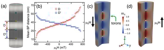To understand this asymmetry, which does not occur for a nanowire hosting an odd number of BPs, we analyze the magnetic pattern when the magnetic field is applied to systems nucleating an odd or even number of BPs. Results are presented in Figure 3c,d and allow us to conclude that the asymmetry in the annihilation field when an even number of BPs is nucleated comes from the existence of two different annihilation processes, depending on the magnetic field direction. If we apply a magnetic field H > 0 into the system, as shown in Figure 3d, the shrinking of one toron occurs, while the two BPs near the wire ends approach the top and bottom surfaces. On the other hand, for H < 0 , we see the shrinking of the two integer torons, which is followed by the motion of two BPs near the ends to the inside of the nanowire (see Figure 3c). This behavior does not occur when an odd number of BPs nucleates in the nanowire—a behavior that is accompanied by appearance of the same number of torons. In both cases, H > 0 and H < 0 , one of the BPs near the wire end moves toward the nanowire top or bottom surface while the other moves to the inside. The motion of the BPs yields the shrinking and stretching of the same number of torons, giving rise to the same annihilation process independent of the direction of the external magnetic field. This behavior is shown in Figure 5, where we present nanowires hosting one (Figure 5a,b) and three BPs (Figure 5c,d). The asymmetry in the annihilation process of torons points to an interesting hysteretic phenomenon. Because the annihilation field strength depends on the direction of the external magnetic field, there should be a bias in the hysteresis loop coming from the different annihilation processes when an even number of BPs are nucleated in the nanowire.
