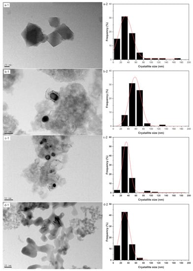 TEM images (-1) and crystallite size distributions (-2): (a) MIL-100 (Fe) nitrate; (b) MDC-A nitrate; (c) MDC-B nitrate; (d) MDMO nitrate.
