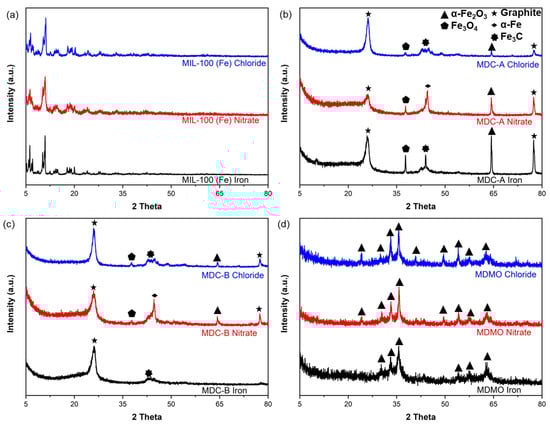 Figure 3a–d displays the XRD patterns for all MIL-100 (Fe), MDC-A, MDC-B, and MDMO. The X-ray powder diffraction patterns of three different types of MIL-100 (Fe) synthesized in this study were well-concordant with MIL-100 (Fe) in previous studies [38,39,40]. After the carbonization and acid washing processes (Figure 3b,c), the distinctive diffraction peaks of MIL100 (Fe) disappear, showing new diffraction lines that are attributed to graphitic carbon (2θ = 26.5° and 77.4°) [41]. Another identifiable signal for MDC-A and MDC-B nitrate can be seen at 2θ = 44.7°, which denotes the presence of α-Fe (JCPDS, No. 87-0722) [42]. Contrarily, only the samples of MDC-A and MDC-B iron and chloride show the existence of Fe3C (2θ = 42.9°, 43.7°, and 45.7°). The Fe incorporated in the MIL-100 (Fe) structure could be heated to form isolated Fe species throughout the synthesis, and at a higher temperature, a portion of these species reacted with carbon to produce Fe3C particles. The reduction of some organic byproducts may be the key to the absence of Fe3C [43]. Its electrocatalytic activity may be enhanced by producing Fe/Fe3C species by accelerating the graphitization of carbons at high temperatures [44,45]. The peak intensity at 37.6° is attributed to Fe3O4 (JCPDS No. 01-089-2335). After high-temperature pyrolysis, the carbon matrix would be treated with acid to create porosity by eliminating some of the Fe/Fe3C species within. XRD peaks of MDMO in Figure 3 agreed well with the previous study [46], indicating that synthesized MDMO is pure α-Fe2O3 (JCPDS No. 33-0664). None of the samples show any additional peaks, proving that the three MDMOs are well-crystallized α-Fe2O3.